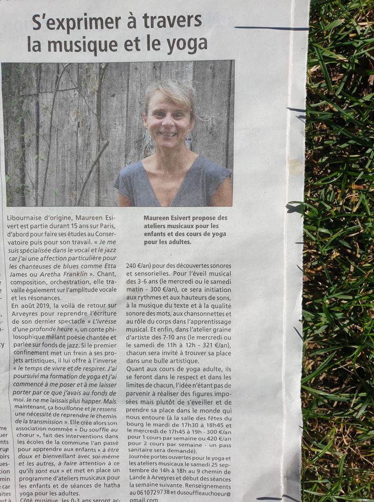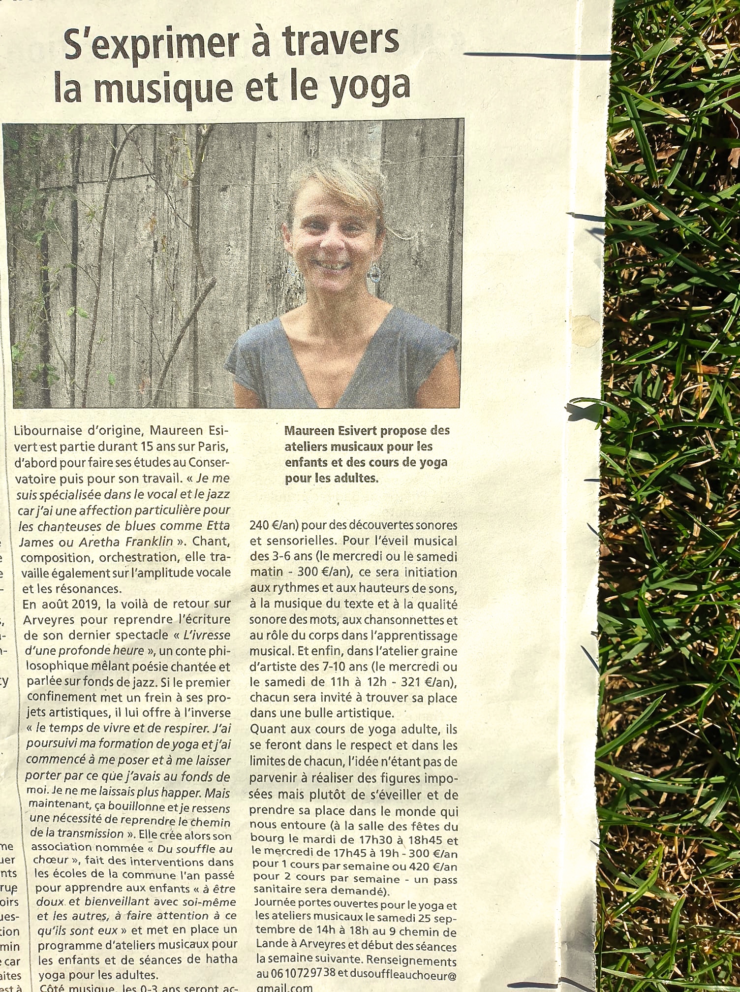 https://www.sudouest.fr/gironde/arveyres/arveyres-l-alliance-de-la-musique-et-du-yoga-6095516.php Article paru dans le Sud Ouest le 25 septembre 2021